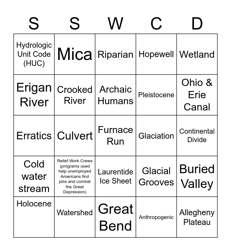 This bingo card has a free space and 24 words: Relief Work Crews (programs used help unemployed Americans find jobs and combat the Great Depression), Watershed, Archaic Humans, Holocene, Wetland, Hydrologic Unit Code (HUC), Erigan River, Mica, Glaciation, Laurentide Ice Sheet, Pleistocene, Erratics, Glacial Grooves, Buried Valley, Crooked River, Anthropogenic, Continental Divide, Riparian, Ohio & Erie Canal, Culvert, Allegheny Plateau, Cold water stream, Hopewell and Great Bend.