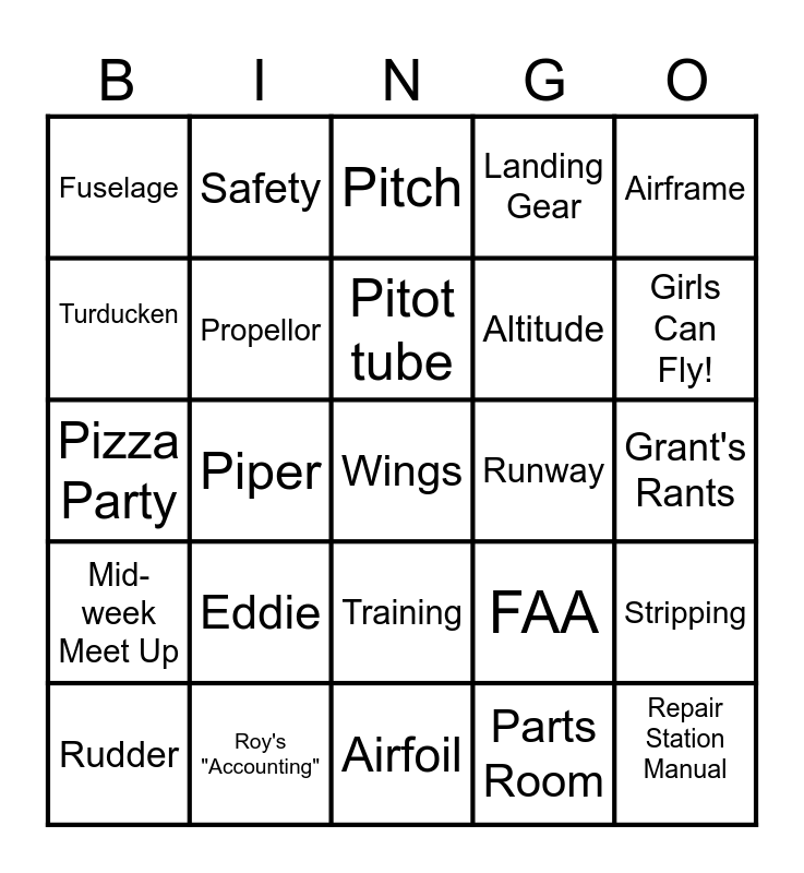 This bingo card has 56 words: Aileron, Rudder, Flaps, Fuselage, Airfoil, Altimeter, Propellor, Elevator, Altitude, Trim, Landing Gear, Dave's Cave, Amelia Earhart, Lift, Thrust, Paint Master Bob, Airframe, Piper, Cessna, Wings, Runway, Control Tower, FAA, Pitch, Airport, Pitot tube, SMS, Throttle, Girls Can Fly!, Bucking, FAA, Snowmobile Stories, EASA, Tomcat, Grant's Rants, Turducken, Pizza Party, Spring Cleaning, Mid-week Meet Up, Safety, Training, Repair Station Manual, Paint Booth, Rivets, Clecos, Eddie, Roy's "Accounting", Skins, Beechcraft, Shipping, Parts Room, Sign Out Parts, Inventory, Paint Booth, Stripping and Metal.