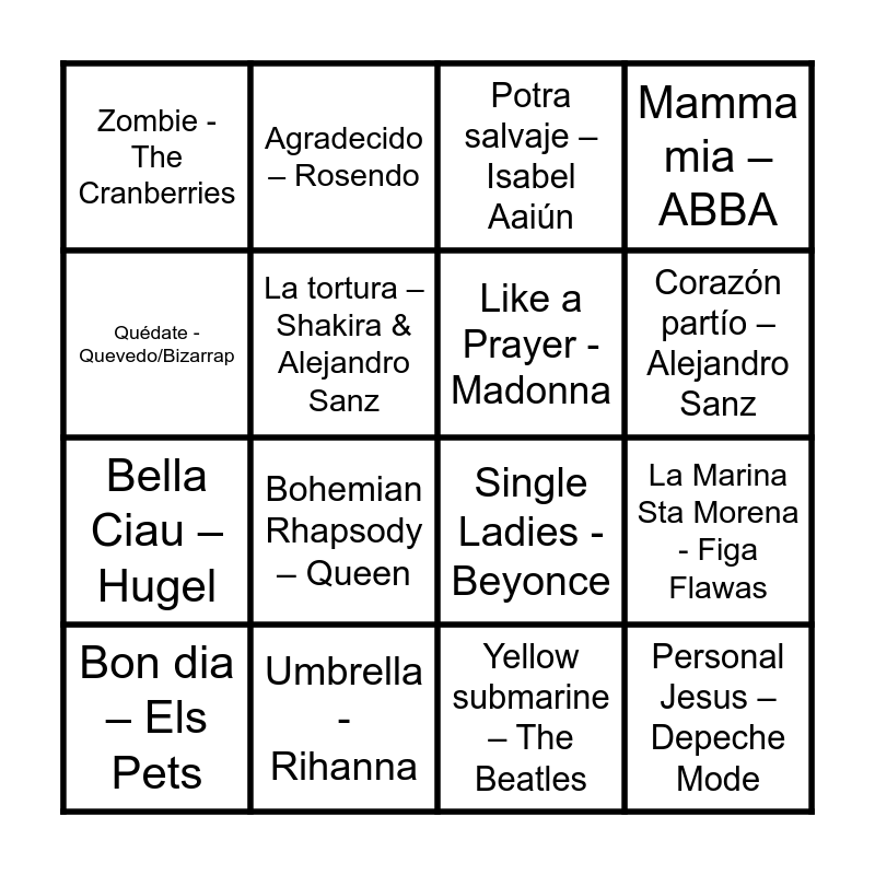 This bingo card has 72 words: Free!, La tortura – Shakira & Alejandro Sanz, Yellow submarine – The Beatles, Millonària – Rosalía, Lloraré las penas - David Bisbal, Cómo una ola – Isabel Pantoja, Potra salvaje – Isabel Aaiún, El vent – Raimon, Quédate - Quevedo/Bizarrap, Thiller – Michael Jackson, Un beso y una flor – Nino Bravo, Vivir así es morir de amor – Camilo Sesto, Bella Ciau – Hugel, Agradecido – Rosendo, Imagine – John Lennon, Mamma mia – ABBA, Viva la vida – Coldplay, Bohemian Rhapsody – Queen, Beautyful day – U2, Corazón partío – Alejandro Sanz, Bon dia – Els Pets, Noches de bohemia – Navajita Plateá, Corazón espinado – Maná/Santana, Personal Jesus – Depeche Mode, La Flaca – Jarabe de Palo, L’Empordà – Sopa de Cabra, Boig per Tu – Sau, GRAN VÍA – Quevedo / Aitana, Músic de carrer – Txarango, Se fué – Laura pausini, The Final Countdown – Europe, La Macarena – Los del Río, EL CLUB – Bad Bunny, Maquillaje – Mecano, Like a Rolling Stone – Bob Dylan, Devuélveme la Vida – Antonio Orozco, Sarandonga – Lolita, Besos – El canto del Loco, Like a Prayer - Madonna, Chica de ayer - Nacha Pop, Dancing Queen – ABBA, Cien gaviotas - Duncan Dhu, La revoución sexual - La Csa Azul, Soldadito marinero - Fito y los fitipaldis, No puedo vivir sin ti - Los Ronaldos, 20 de abril - Celtas Cortos, Ni tú ni nadie - Alaska, Por la raja de tu Falda - Estopa, Carolina - M-Clan, Tenía tanto que darte - Nena Daconte, Tití me preguntó - Bad Bunny, Creep - Radiohead, A quién le importa -Alaska, Hotel California - Eagles, Don't speak - No dubt, Stairway to Heaven - Led Zeppelin, Zombie - The Cranberries, Umbrella - Rihanna, Stan - Eminem, Dido, I Gotta Feeling - Black Eyed Peas, Genie in a Botle- Cristina Aguilera, Tobogan - Zoo, Supermercat - Lildami, La Marina Sta Morena - Figa Flawas, Camals Mullats - La Gossa Sorda, Jenifer - Els Catarres, Single Ladies - Beyonce, Wannabe - Spice Girls, Coti X Coti - The Tyets, Bad romance - Lady Gaga, Gassolina - Daddy Yankee and Bomba - King Africa.