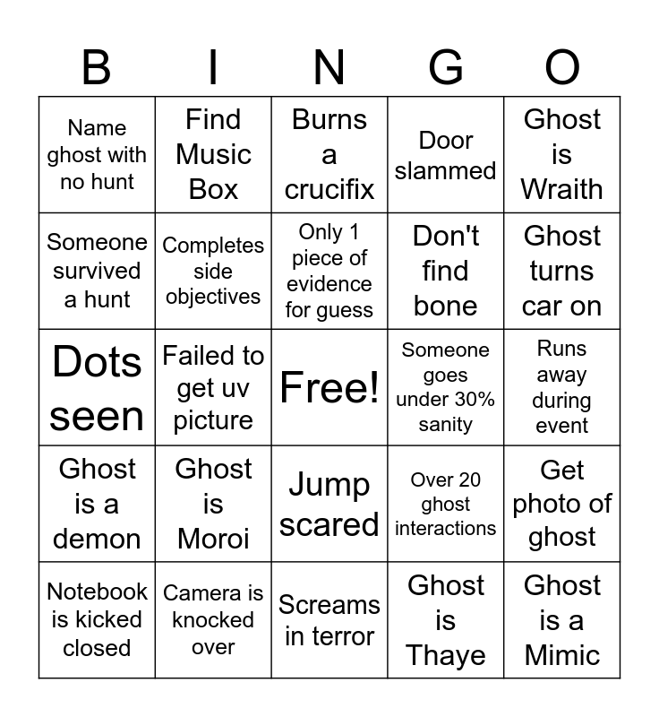 This bingo card has a free space and 54 words: Someone died in a hunt, Ghost is a demon, Find bone, Find summoning circle, Jump scared, Ghost is a Yurei, Door slammed, Ghost appears, Someone survived a hunt, Find mirror, Name ghost with no hunt, Ghost is a Raiju, Camera is knocked over, Notebook is kicked closed, Hide in closet, Screams in terror, Ghost is a Mimic, Don't find bone, Find monkey paw, Runs away during event, Over 20 ghost interactions, Over 2 hunts, Someone goes under 30% sanity, Ghost is Wraith, Ghost is Oni, Find Music Box, Full team death, Leave camera behind when leaving, Leave more than 3 pieces of equipment behind, Ghost is Thaye, Ghost is Banshee, Ghost is Poltergeist, Team average is under 30%, Run out of sanity meds, Burns a crucifix, Steps in salt, Dots seen, Get photo of ghost, Does not complete side objectives, Completes side objectives, Uses cursed object, Singing event, Banshee scream, Crucifix ignored, Ghost is Moroi, Ghost is yokai, Ghost is onryo, Guess ghost wrong, Only 1 piece of evidence for guess, Failed to get uv picture, Ghost turns car on, Ghost turns lights off, Ghost turns lights on and Ghost is Hantu.
