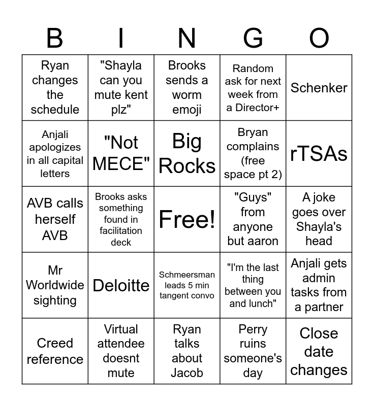 This bingo card has a free space and 30 words: Virtual attendee doesnt mute, Neil asks about non-US conditions, Brooks asks something found in facilitation deck, IT team doesnt follow instructions, Ryan changes the schedule, Brooks sends a worm emoji, "Not MECE", Schmeersman leads 5 min tangent convo, "Guys" from anyone but aaron, Ryan talks about Jacob, A joke goes over Shayla's head, Close date changes, Perry ruins someone's day, PW / BF perimeter, rTSAs, Eating on camera, "I'm the last thing between you and lunch", Mr Worldwide sighting, Deloitte, Schenker, AVB calls herself AVB, Jacob messes up the mute buttons, "Shayla can you mute kent plz", Bryan complains (free space pt 2), Anjali apologizes in all capital letters, Random ask for next week from a Director+, Anjali gets admin tasks from a partner, Creed reference, Big Rocks and Critical path.