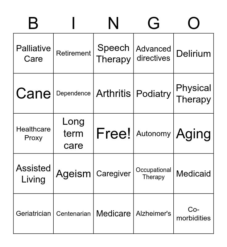 This bingo card has a free space and 34 words: Nursing home, Alzheimer's, Hearing aid, Purpose, Assisted Living, Dependence, Delirium, Geriatrician, Retirement, Mortality, Arthritis, Speech Therapy, Baby Boomer, Life, Autonomy, Physical Therapy, Centenarian, Healthcare Proxy, Ageism, Occupational Therapy, Caregiver, Health Insurance, Palliative Care, Aging, Medicare, Co-morbidities, Advanced directives, Dentures, Podiatry, Cane, Social Security, Long term care, Medicaid and Family.