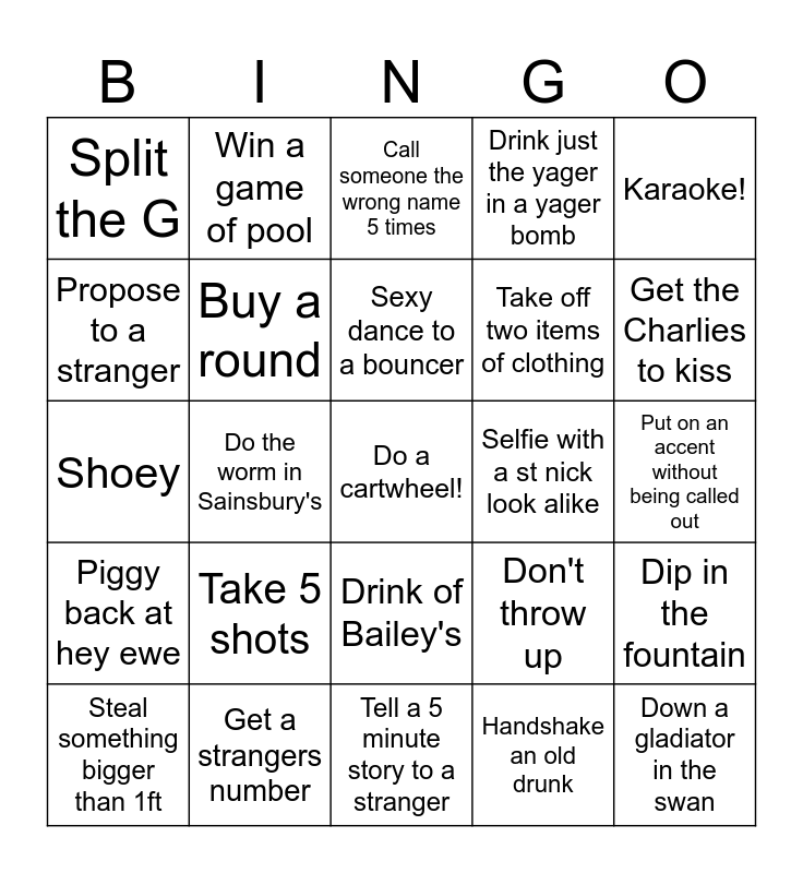 This bingo card has a free space and 24 words: Take 5 shots, Get a strangers number, Sexy dance to a bouncer, Steal something bigger than 1ft, Karaoke!, Split the G, Propose to a stranger, Win a game of pool, Selfie with a st nick look alike, Drink of Bailey's, Take off two items of clothing, Shoey, Don't throw up, Dip in the fountain, Buy a round, Handshake an old drunk, Put on an accent without being called out, Call someone the wrong name 5 times, Get the Charlies to kiss, Do the worm in Sainsbury's, Down a gladiator in the swan, Piggy back at hey ewe, Drink just the yager in a yager bomb and Tell a 5 minute story to a stranger.