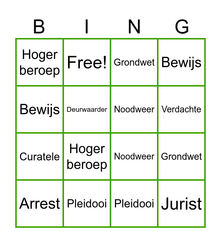 ⚠ This card has duplicate items: Advocaat (2), Kantonrechter (2), Strafrecht (2), Verdachte (3), Jurist (2), Noodweer (2), Bewijs (2), Officier van justitie (2), Griffier (2), Grondwet (2), Curatele (2), Cassatie (2), Pleidooi (2), Hoger beroep (2)