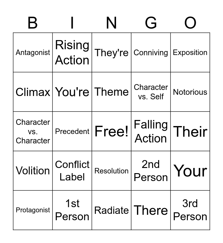 This bingo card has a free space and 24 words: Conflict Label, 1st Person, Theme, Protagonist, Exposition, Antagonist, Climax, Rising Action, Falling Action, Resolution, Character vs. Self, Character vs. Character, 2nd Person, Your, You're, There, Their, They're, Notorious, Precedent, 3rd Person, Volition, Conniving and Radiate.