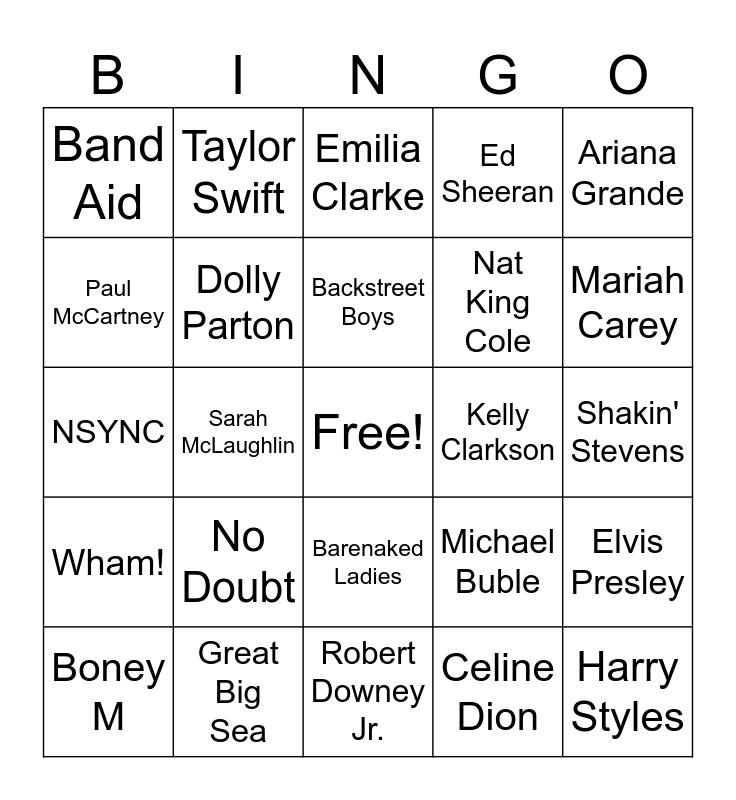 This bingo card has a free space and 24 words: No Doubt, Great Big Sea, Backstreet Boys, Boney M, Ariana Grande, Band Aid, Paul McCartney, Taylor Swift, Kelly Clarkson, Barenaked Ladies, Nat King Cole, NSYNC, Michael Buble, Elvis Presley, Dolly Parton, Celine Dion, Shakin' Stevens, Emilia Clarke, Mariah Carey, Sarah McLaughlin, Harry Styles, Wham!, Ed Sheeran and Robert Downey Jr..