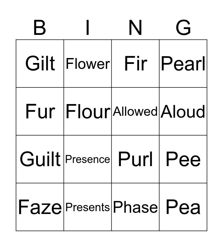 This bingo card has a free space and 15 words: Faze, Pea, Fir, Gilt, Aloud, Fur, Presence, Phase, Flour, Guilt, Pee, Pearl, Allowed, Flower and Presents.