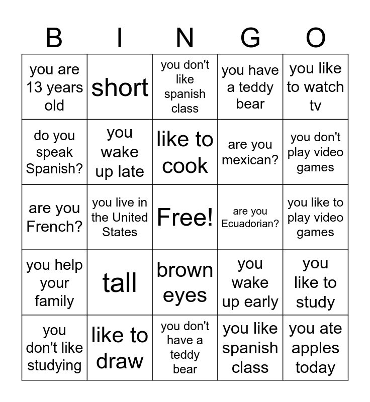 This bingo card has a free space and 24 words: tall, like to draw, like to cook, you don't like studying, you like to watch tv, you are 13 years old, do you speak Spanish?, short, are you Ecuadorian?, brown eyes, are you mexican?, are you French?, you wake up early, you like to study, you wake up late, you like spanish class, you like to play video games, you don't like spanish class, you don't play video games, you live in the United States, you ate apples today, you help your family, you have a teddy bear and you don't have a teddy bear.