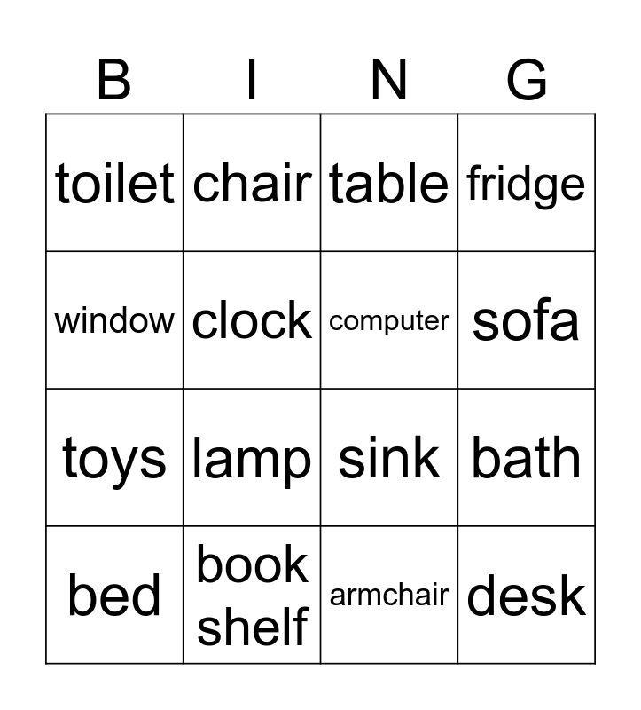This bingo card has 18 words: lamp, desk, table, toilet, sink, fridge, bed, chair, sofa, toys, armchair, window, bath, clock, computer, cooker, book shelf and TV.