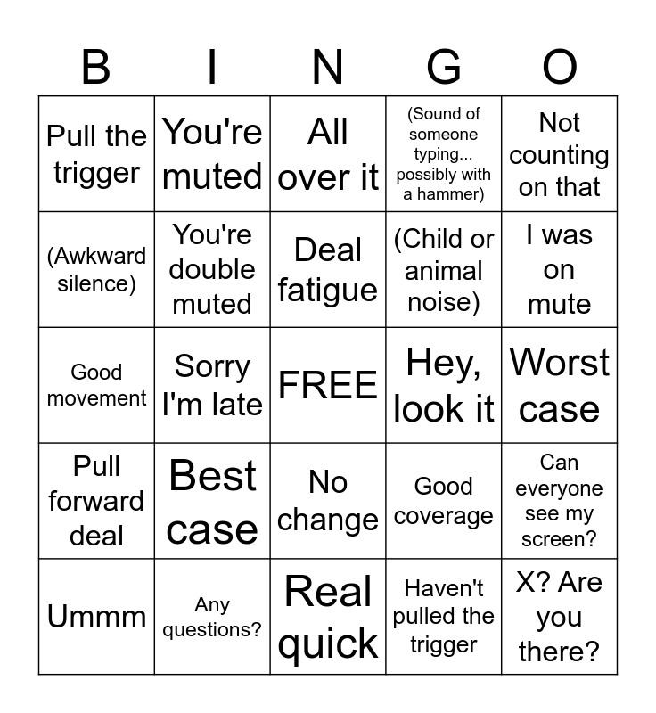 This bingo card has a free space and 34 words: Can you hear me?, Haven't pulled the trigger, Upside on this one, Tracking nicely, Pull forward deal, You're double muted, Not counting on that, Ummm, You're muted, Hats off, Deal fatigue, All over it, I'll have more tomorrow, That's a wrap, Hey, look it, I was on mute, Any questions?, Good movement, Best case, Good coverage, No change, You out there?, Pull the trigger, Worst case, Real quick, X? Are you there?, (Sound of someone typing... possibly with a hammer), Ok, let's get started, (Child or animal noise), (Awkward silence), Screen share malfunction, Sorry I'm late, Can everyone see my screen? and Mute your phones please.