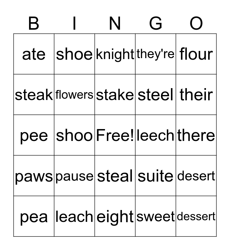 This bingo card has a free space and 24 words: pause, leach, stake, pea, flour, ate, steak, shoe, leech, steal, steel, pee, suite, desert, flowers, sweet, there, knight, their, shoo, dessert, paws, they're and eight.