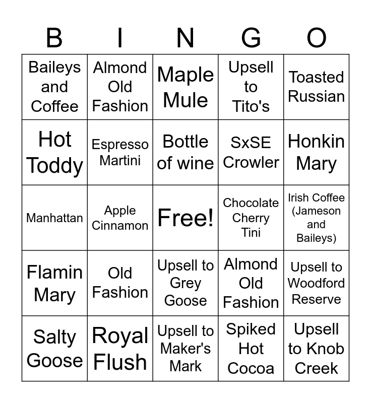 This bingo card has a free space and 24 words: Old Fashion, Royal Flush, Bottle of wine, Salty Goose, Toasted Russian, Baileys and Coffee, Hot Toddy, Almond Old Fashion, Chocolate Cherry Tini, Upsell to Grey Goose, SxSE Crowler, Manhattan, Almond Old Fashion, Upsell to Woodford Reserve, Espresso Martini, Spiked Hot Cocoa, Irish Coffee (Jameson and Baileys), Maple Mule, Honkin Mary, Apple Cinnamon, Upsell to Knob Creek, Flamin Mary, Upsell to Tito's and Upsell to Maker's Mark.