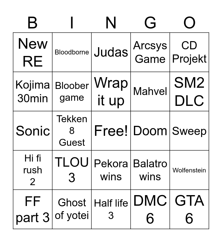 This bingo card has a free space and 24 words: TLOU 3, Ghost of yotei, Wrap it up, FF part 3, CD Projekt, New RE, Kojima 30min, Bloodborne, Doom, Pekora wins, Mahvel, Sonic, Balatro wins, Wolfenstein, Bloober game, DMC 6, Sweep, Judas, SM2 DLC, Tekken 8 Guest, GTA 6, Hi fi rush 2, Arcsys Game and Half life 3.