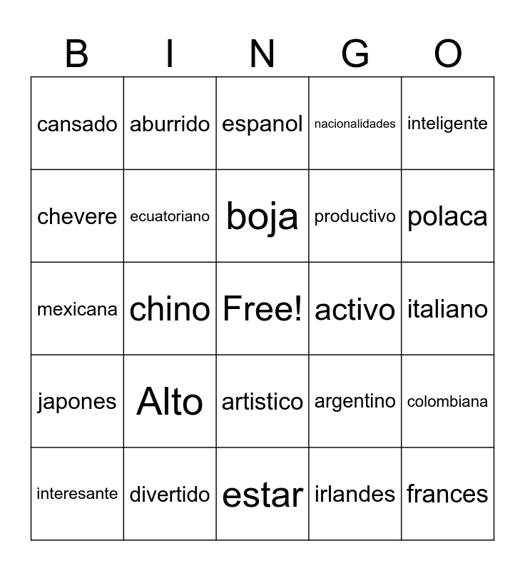 This bingo card has a free space and 24 words: Alto, divertido, boja, interesante, inteligente, cansado, chevere, aburrido, activo, artistico, productivo, mexicana, argentino, colombiana, ecuatoriano, irlandes, italiano, espanol, polaca, chino, frances, japones, nacionalidades and estar.