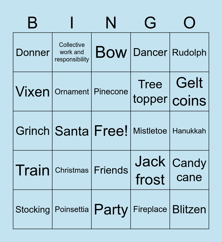 This bingo card has a free space and 60 words: Candy, Poinsettia, Gingerbread, Train, Fireplace, Angel, Ornament, Garland, Tree topper, Dasher, Dancer, Prancer, Vixen, Comet, Cupid, Donner, Blitzen, Rudolph, Gift, Pinecone, Mistletoe, Bow, Stocking, Candy cane, Tinsel, Hot chocolate, Menorah, Dreidel, Gelt coins, Torah, Latke, Dove, Candles, Unity, Collective work and responsibility, Drums, Family, Santa, Snowman, Grinch, Snowflake, Christmas, Hanukkah, Kwanzaa, Jack frost, Christmas tree, Clay, Milk & Cookies, Pickles, Friends, Party, Lights, Advent calendar, Self-determination, Cooperative economics, Purpose, Creativity, Faith, Wrapping paper and Mug.