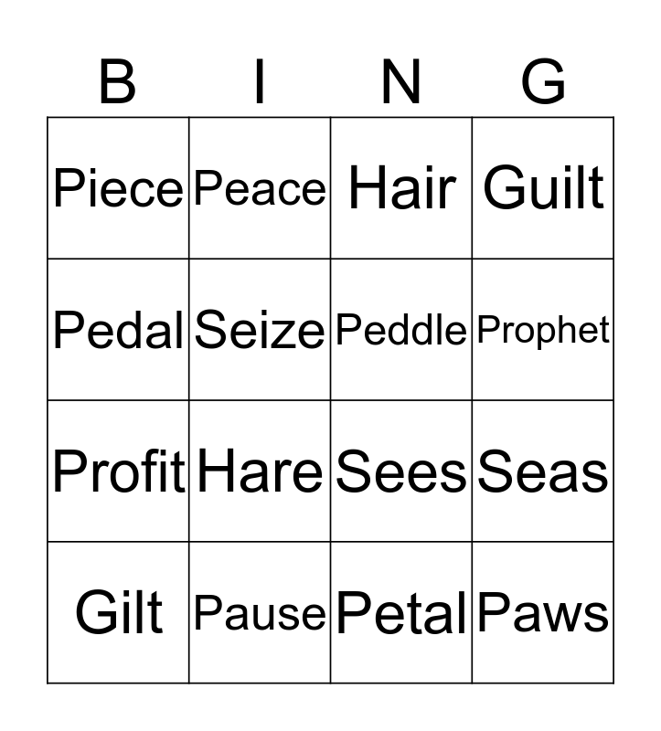 This bingo card has 16 words: Pause, Seas, Hair, Piece, Profit, Peace, Sees, Petal, Pedal, Seize, Gilt, Guilt, Hare, Prophet, Peddle and Paws.