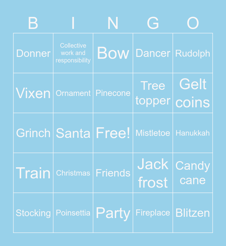 This bingo card has a free space and 60 words: Candy, Poinsettia, Gingerbread, Train, Fireplace, Angel, Ornament, Garland, Tree topper, Dasher, Dancer, Prancer, Vixen, Comet, Cupid, Donner, Blitzen, Rudolph, Gift, Pinecone, Mistletoe, Bow, Stocking, Candy cane, Tinsel, Hot chocolate, Menorah, Dreidel, Gelt coins, Torah, Latke, Dove, Candles, Unity, Collective work and responsibility, Drums, Family, Santa, Snowman, Grinch, Snowflake, Christmas, Hanukkah, Kwanzaa, Jack frost, Christmas tree, Clay, Milk & Cookies, Pickles, Friends, Party, Lights, Advent calendar, Self-determination, Cooperative economics, Purpose, Creativity, Faith, Wrapping paper and Mug.