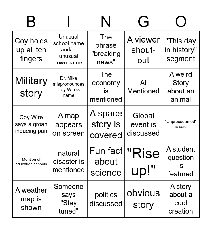This bingo card has 25 words: natural disaster is mentioned, politics discussed, The economy is mentioned, A weather map is shown, "This day in history" segment, Coy holds up all ten fingers, Military story, Unusual school name and/or unusual town name, Global event is discussed, Fun fact about science, AI Mentioned, Coy Wire says a groan inducing pun, "Rise up!", A student question is featured, Dr. Mike mispronounces Coy Wire's name, A story about a cool creation, "Unprecedented" is said, The phrase "breaking news", A weird Story about an animal, A map appears on screen, A space story is covered, Someone says "Stay tuned", Mention of education/schools, A viewer shout-out and obvious story.