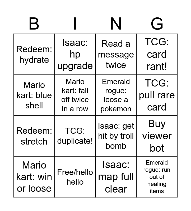 This bingo card has 16 words: Free/hello hello, Buy viewer bot, Read a message twice, Redeem: hydrate, Redeem: stretch, Isaac: hp upgrade, Isaac: get hit by troll bomb, Isaac: map full clear, Mario kart: blue shell, Mario kart: fall off twice in a row, Mario kart: win or loose, TCG: card rant!, TCG: duplicate!, TCG: pull rare card, Emerald rogue: loose a pokemon and Emerald rogue: run out of healing items.
