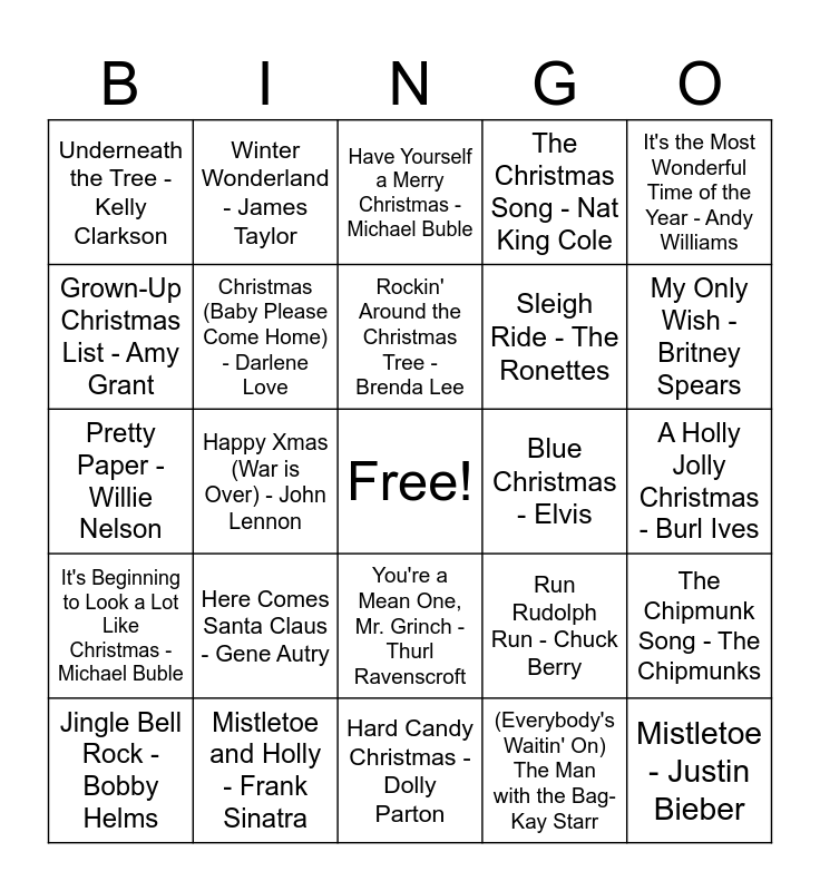 This bingo card has a free space and 39 words: All I Want for Christmas is You - Mariah Carey, Santa Baby - Eartha Kitt, You Make it Feel Like Christmas - Gwen Stefani and Blake Shelton, Christmas (Baby Please Come Home) - Darlene Love, Jingle Bell Rock - Bobby Helms, You're a Mean One, Mr. Grinch - Thurl Ravenscroft, Rockin' Around the Christmas Tree - Brenda Lee, Last Christmas - Wham!, It's the Most Wonderful Time of the Year - Andy Williams, It's Beginning to Look a Lot Like Christmas - Michael Buble, Happy Xmas (War is Over) - John Lennon, The Christmas Song - Nat King Cole, Mistletoe - Justin Bieber, A Holly Jolly Christmas - Burl Ives, Blue Christmas - Elvis, Here Comes Santa Claus - Gene Autry, Believe - Josh Groban, Underneath the Tree - Kelly Clarkson, Feliz Navidad - Jose Feliciano, Run Rudolph Run - Chuck Berry, Grown-Up Christmas List - Amy Grant, Hard Candy Christmas - Dolly Parton, Sleigh Ride - The Ronettes, My Only Wish - Britney Spears, DJ Play a Christmas Song - Cher, Let it Snow! - Dean Martin, I Want a Hippopotamus for Christmas - Gayle Peevey, Where Are You Christmas? - Faith Hill, Christmas Tree Farm - Taylor Swift, Winter Wonderland - James Taylor, O Tannenbaum - Vince Guardaldi Trio, Santa Claus is Comin to Town - Jackson 5, Have Yourself a Merry Christmas - Michael Buble, Mistletoe and Holly - Frank Sinatra, (Everybody's Waitin' On) The Man with the Bag- Kay Starr, Grandma Got Ran Over by a Reindeer - Elmo and Patsy, The Chipmunk Song - The Chipmunks, Pretty Paper - Willie Nelson and Santa Tell Me - Ariana Grande.