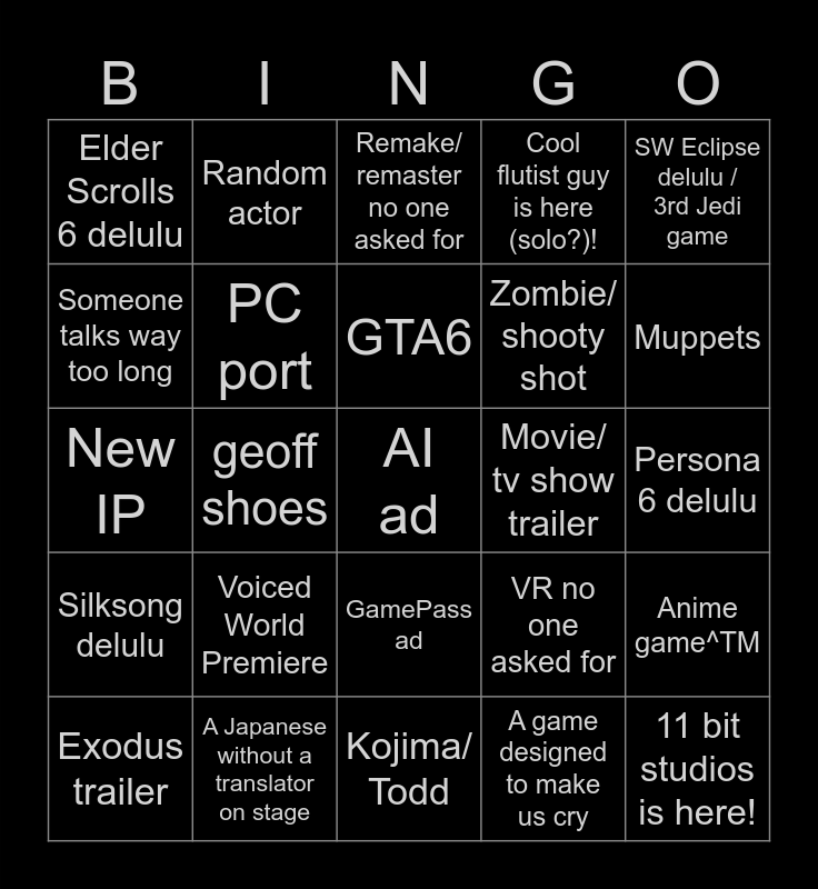This bingo card has 25 words: Voiced World Premiere, Kojima/ Todd, GTA6, Exodus trailer, SW Eclipse delulu / 3rd Jedi game, Elder Scrolls 6 delulu, Someone talks way too long, Random actor, Movie/ tv show trailer, GamePass ad, Zombie/ shooty shot, New IP, VR no one asked for, Anime game^TM, PC port, 11 bit studios is here!, Persona 6 delulu, Remake/ remaster no one asked for, Muppets, geoff shoes, AI ad, A Japanese without a translator on stage, Silksong delulu, Cool flutist guy is here (solo?)! and A game designed to make us cry.