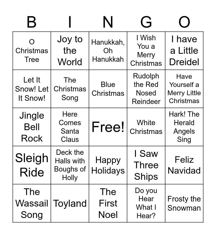 This bingo card has a free space and 42 words: A Holly Jolly Christmas, Blue Christmas, Carol of the Bells, Deck the Halls with Boughs of Holly, Do you Hear What I Hear?, Feliz Navidad, Frosty the Snowman, Good King Wenceslas, Hanukkah, Oh Hanukkah, Happy Holidays, Hark! The Herald Angels Sing, Have Yourself a Merry Little Christmas, Here Comes Santa Claus, I have a Little Dreidel, I Saw Mommy Kissing Santa Claus, I Saw Three Ships, It's Beginning to Look Like Christmas, Jingle Bell Rock, Jingle Bells, Joy to the World, Let It Snow! Let It Snow!, Little Saint Nick, My Favorite Things, O Christmas Tree, O Holy Night, Rockin' Around the Christmas Tree, Rudolph the Red Nosed Reindeer, Run Rudolph Run, Santa Baby, Silent Night, Silver Bells, Sleigh Ride, The Christmas Song, The First Noel, The Holly & The Ivy, The Wassail Song, Toyland, White Christmas, Winter Wonderland, You're A Mean One, Mr. Grinch, I Wish You a Merry Christmas and The Little Drummer Boy.