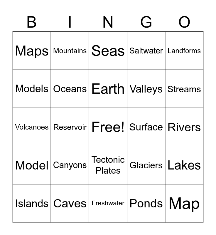 This bingo card has a free space and 24 words: Canyons, Caves, Earth, Islands, Landforms, Maps, Models, Mountains, Surface, Tectonic Plates, Valleys, Volcanoes, Glaciers, Lakes, Oceans, Ponds, Rivers, Seas, Streams, Reservoir, Map, Model, Saltwater and Freshwater.