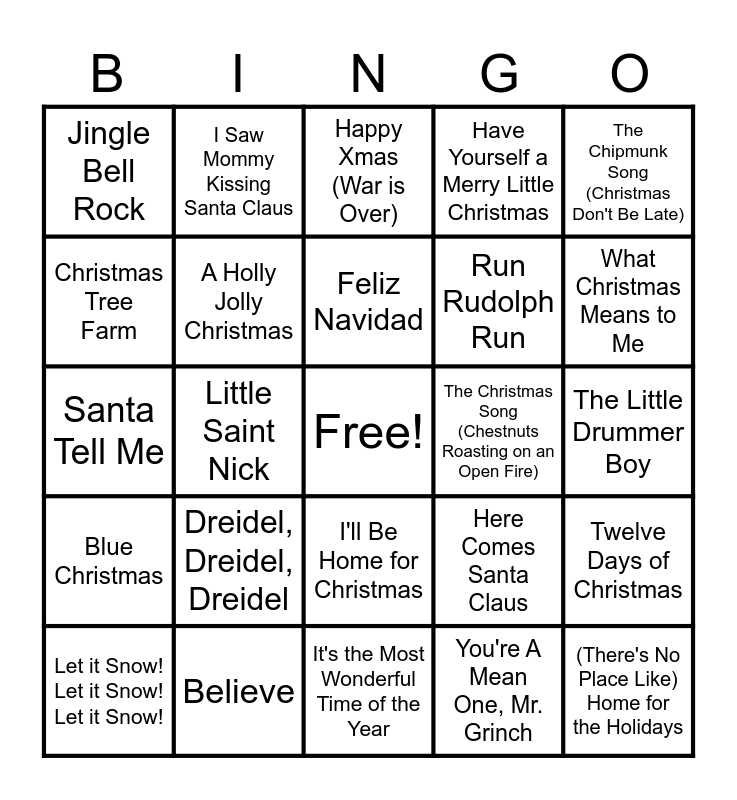 This bingo card has a free space and 55 words: Rockin' Around the Christmas Tree, Let it Snow! Let it Snow! Let it Snow!, It's Beginning to Look a Lot Like Christmas, Jingle Bell Rock, It's the Most Wonderful Time of the Year, Winter Wonderland, A Holly Jolly Christmas, Rudolph the Red-Nosed Reindeer, Run Rudolph Run, Silver Bells, Have Yourself a Merry Little Christmas, Wonderful Christmastime, Frosty the Snowman, Christmas Time Is Here, Last Christmas, Mele Kaikimaka, The Chipmunk Song (Christmas Don't Be Late), Little Saint Nick, Baby, It's Cold Outside, (There's No Place Like) Home for the Holidays, The Christmas Song (Chestnuts Roasting on an Open Fire), Santa Baby, Here Comes Santa Claus, Happy Xmas (War is Over), Santa Claus Is Coming to Town, Feliz Navidad, You're A Mean One, Mr. Grinch, Merry Christmas, Happy Holidays, The Little Drummer Boy, Twelve Days of Christmas, Mistletoe, Holly Jolly Christmas, I Want a Hippopotamus for Christmas, All I Want for Christmas Is You, Christmas Tree Farm, Santa Tell Me, Sleigh Ride, Blue Christmas, White Christmas, All I Want for Christmas is My Two Front Teeth, I Saw Mommy Kissing Santa Claus, We Wish You a Merry Christmas, Deck The Halls, Do You Want to Build a Snowman?, Dreidel, Dreidel, Dreidel, Believe, Christmas Vacation, My Only Wish (This Year), This Christmas, What Christmas Means to Me, Do You Hear What I Hear?, Christmas (Baby Please Come Home), Up On The House Top, I'll Be Home for Christmas and Underneath the Tree.