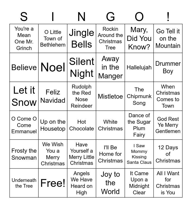 This bingo card has 39 words: Free!, Underneath the Tree, Let it Be Christmas, Believe, Hot Chocolate, When Christmas Comes to Town, Noel, All I Want for Christmas is You, Mary, Did You Know?, Mistletoe, Drummer Boy, Rockin Around the Christmas Tree, Let it Snow, Rudolph the Red Nose Reindeer, Feliz Navidad, The Chipmunk Song, I Saw Mommy Kissing Santa Claus, You're a Mean One Mr. Grinch, Angels We Have Heard on High, O Come O Come Emmanuel, Go Tell it on the Mountain, Dance of the Sugar Plum Fairy, Silent Night, Away in the Manger, Joy to the World, Have Yourself a Merry Little Christmas, Frosty the Snowman, It Came Upon a Midnight Clear, We Wish You a Merry Christmas, O Little Town of Bethlehem, We Three Kings, 12 Days of Christmas, Jingle Bells, White Christmas, God Rest Ye Merry Gentlemen, I'll Be Home for Christmas, Up on the Housetop, Hallelujah and Deck the Halls.