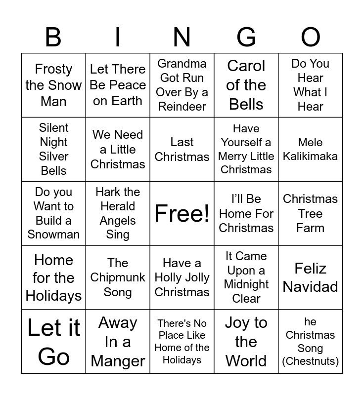 This bingo card has a free space and 70 words: Angels We Have Heard on High, Christmas Tree Farm, Auld Lang Syne, Christmas Wrapping, Away In a Manger, Blue Christmas, Carol of the Bells, Deck the Halls, Do You Hear What I Hear, Christmas in Hollis, Feliz Navidad, Dreidel, Dreidel, Dreidel, Frosty the Snow Man, Grandma Got Run Over By a Reindeer, Happy Holidays, Hark the Herald Angels Sing, Have a Holly Jolly Christmas, Have Yourself a Merry Little Christmas, Here Comes Santa Claus, Home for the Holidays, I’ll Be Home For Christmas, It Came Upon a Midnight Clear, Mele Kalikimaka, It’s Beginning to Look a Lot Like Christmas, It’s the Most Wonderful Time of the Year, Jingle Bells, Jingle Bell Rock, Jolly Old St. Nicholas, Joy to the World, Let It Snow, Let It Snow, Let It Snow, Let There Be Peace on Earth, Little Drummer Boy, O’ Christmas Tree, O’ Holy Night, O’ Come All Ye Faithful, O’ Little Town of Bethlehem, Rockin’ Around the Christmas Tree, Rudolph the Red Nosed Reindeer, Santa Claus Is Comin’ To Town, Silent Night Silver Bells, Sleigh Ride, The Chipmunk Song, he Christmas Song (Chestnuts), The First Noel, The Twelve Days of Christmas, We Need a Little Christmas, Let it Go, Run Rudolph Run, O Tannenbaum, Blue Christmas, Jingle Bell Rock, We Three Kings, Christmas Canon, Run Rudolph Run, There's No Place Like Home of the Holidays, I Want a Hippopotamus for Christmas, Last Christmas, Christmas Eve (Sarajevo 12/24), Happy XMas (War is Over), Dance of the Sugar Plum Fairies, Do you Want to Build a Snowman, Santa Baby, All I Want for Christmas is You, We Wish You a Merry Christmas, We’re Going on a Sleigh Ride, Linus & Lucy (Peanuts Theme), Hallelujah, Winter Wonderland, You're a Mean One, Mr. Grinch and All I Want for Christmas is My Two Front Teeth.