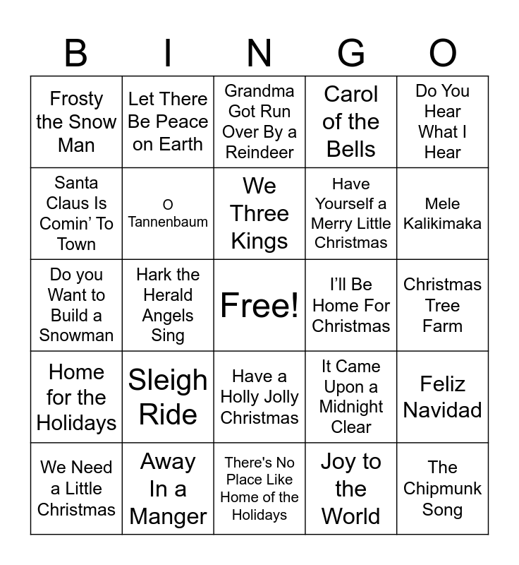 This bingo card has a free space and 69 words: Angels We Have Heard on High, Christmas Tree Farm, Auld Lang Syne, Christmas Wrapping, Away In a Manger, Blue Christmas, Carol of the Bells, Deck the Halls, Do You Hear What I Hear, Christmas in Hollis, Feliz Navidad, Dreidel, Dreidel, Dreidel, Frosty the Snow Man, Grandma Got Run Over By a Reindeer, Happy Holidays, Hark the Herald Angels Sing, Have a Holly Jolly Christmas, Have Yourself a Merry Little Christmas, Here Comes Santa Claus, Home for the Holidays, I’ll Be Home For Christmas, It Came Upon a Midnight Clear, Mele Kalikimaka, It’s Beginning to Look a Lot Like Christmas, It’s the Most Wonderful Time of the Year, Jingle Bells, Jingle Bell Rock, Jolly Old St. Nicholas, Joy to the World, Let It Snow, Let It Snow, Let It Snow, Let There Be Peace on Earth, Little Drummer Boy, O’ Christmas Tree, O’ Holy Night, O’ Come All Ye Faithful, O’ Little Town of Bethlehem, Rockin’ Around the Christmas Tree, Rudolph the Red Nosed Reindeer, Santa Claus Is Comin’ To Town, Silent Night Silver Bells, Sleigh Ride, The Chipmunk Song, he Christmas Song (Chestnuts), The First Noel, The Twelve Days of Christmas, We Need a Little Christmas, Let it Go, Christmas Rappin, My Favorite Things, O Tannenbaum, We Three Kings, Christmas Canon, Run Rudolph Run, There's No Place Like Home of the Holidays, I Want a Hippopotamus for Christmas, Last Christmas, Christmas Eve (Sarajevo 12/24), Happy XMas (War is Over), Dance of the Sugar Plum Fairies, Do you Want to Build a Snowman, Santa Baby, All I Want for Christmas is You, We Wish You a Merry Christmas, We’re Going on a Sleigh Ride, Linus & Lucy (Peanuts Theme), Hallelujah, Winter Wonderland, You're a Mean One, Mr. Grinch and All I Want for Christmas is My Two Front Teeth.