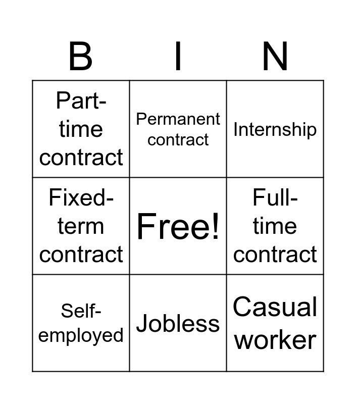 This bingo card has a free space and 9 words: Self-employed, Internship, Permanent contract, Fixed-term contract, Part-time contract, Full-time contract, Casual worker, Moonlighting and Jobless.