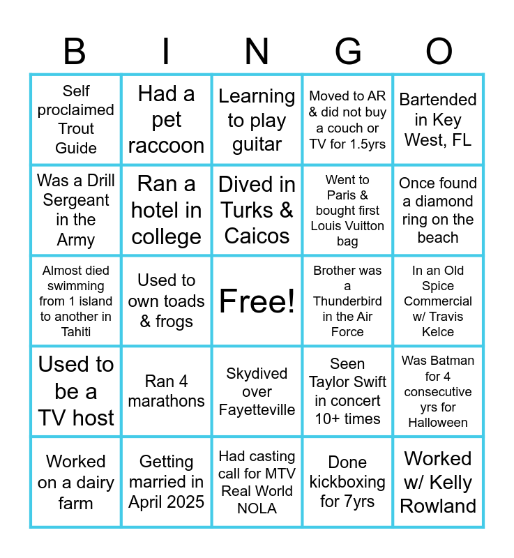 This bingo card has a free space and 24 words: Worked on a dairy farm, Ran 4 marathons, Dived in Turks & Caicos, Done kickboxing for 7yrs, Bartended in Key West, FL, Self proclaimed Trout Guide, Had a pet raccoon, Learning to play guitar, Brother was a Thunderbird in the Air Force, In an Old Spice Commercial w/ Travis Kelce, Almost died swimming from 1 island to another in Tahiti, Ran a hotel in college, Seen Taylor Swift in concert 10+ times, Was Batman for 4 consecutive yrs for Halloween, Was a Drill Sergeant in the Army, Getting married in April 2025, Had casting call for MTV Real World NOLA, Moved to AR & did not buy a couch or TV for 1.5yrs, Once found a diamond ring on the beach, Used to be a TV host, Used to own toads & frogs, Skydived over Fayetteville, Went to Paris & bought first Louis Vuitton bag and Worked w/ Kelly Rowland.