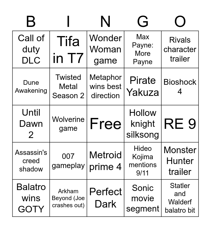 This bingo card has a free space and 24 words: 007 gameplay, Arkham Beyond (Joe crashes out), Metaphor wins best direction, Balatro wins GOTY, Rivals character trailer, Call of duty DLC, Dune Awakening, Tifa in T7, Hollow knight silksong, Metroid prime 4, Pirate Yakuza, Until Dawn 2, Hideo Kojima mentions 9/11, Monster Hunter trailer, Twisted Metal Season 2, Sonic movie segment, RE 9, Wonder Woman game, Bioshock 4, Wolverine game, Statler and Walderf balatro bit, Assassin's creed shadow, Max Payne: More Payne and Perfect Dark.