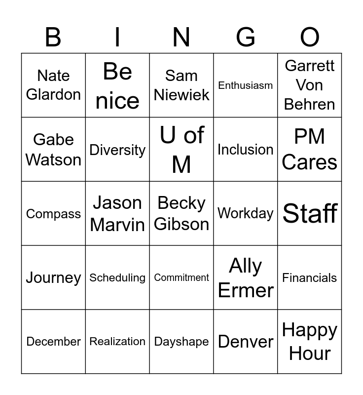 This bingo card has 51 words: Free!, Skydiving, High-Five, Dayshape, Workday, Budget, Nate Glardon, Matthew Lussier, Sam Niewiek, Joey Jurkovic, Garrett Von Behren, Gabe Watson, Jason Marvin, Becky Gibson, Heroes, PPA, Compass, Diversity, Equity, Inclusion, PM Cares, Holiday Party, Be nice, U of M, MSU, Happy Hour, Journey, Pioneer, Commitment, Enthusiasm, Recruiting, ITS, NTO, SALT, Buddy, Financials, Charge hour, Realization, Net Revenue, Partners, Staff, Grand Rapids, Chicago, Los Angeles, Denver, Ohio, December, Scheduling, Kelly Tank, Ally Ermer and Ping pong.