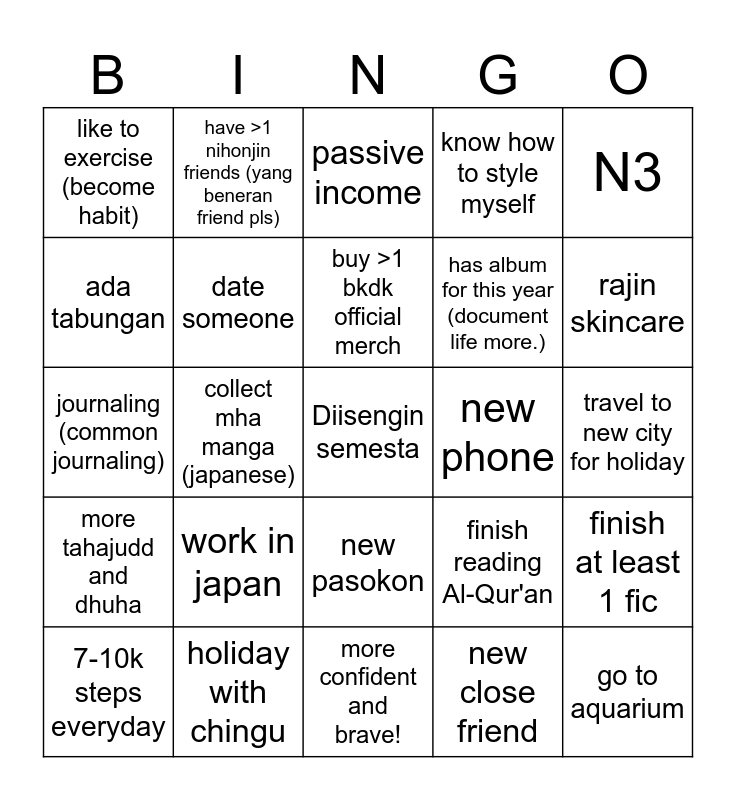 This bingo card has a free space and 24 words: work in japan, holiday with chingu, buy >1 bkdk official merch, 7-10k steps everyday, N3, like to exercise (become habit), ada tabungan, have >1 nihonjin friends (yang beneran friend pls), new phone, new pasokon, has album for this year (document life more.), journaling (common journaling), finish reading Al-Qur'an, finish at least 1 fic, date someone, new close friend, travel to new city for holiday, passive income, rajin skincare, collect mha manga (japanese), go to aquarium, more tahajudd and dhuha, know how to style myself and more confident and brave!.