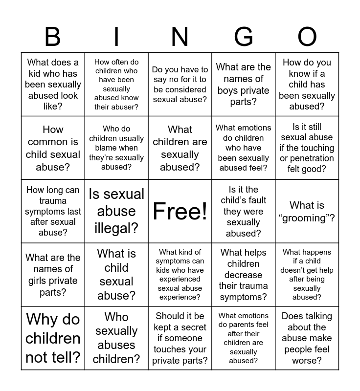 This bingo card has a free space and 24 words: What is child sexual abuse?, Who sexually abuses children?, What children are sexually abused?, Why do children not tell?, How do you know if a child has been sexually abused?, What does a kid who has been sexually abused look like?, How common is child sexual abuse?, How often do children who have been sexually abused know their abuser?, Is it the child’s fault they were sexually abused?, What kind of symptoms can kids who have experienced sexual abuse experience?, What emotions do children who have been sexually abused feel?, How long can trauma symptoms last after sexual abuse?, What helps children decrease their trauma symptoms?, What happens if a child doesn’t get help after being sexually abused?, Who do children usually blame when they’re sexually abused?, What emotions do parents feel after their children are sexually abused?, What is “grooming”?, Do you have to say no for it to be considered sexual abuse?, Is it still sexual abuse if the touching or penetration felt good?, Is sexual abuse illegal?, Does talking about the abuse make people feel worse?, What are the names of girls private parts?, What are the names of boys private parts? and Should it be kept a secret if someone touches your private parts?.