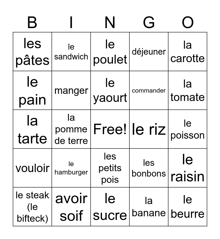 This bingo card has a free space and 62 words: avoir faim, avoir soif, prendre, vouloir, prendre le petit-déjeuner, dîner, manger, boire, commander, payer, déjeuner, prendre le dessert, le pain, le croissant, les frites, les pâtes, le beurre, la carotte, le gâteau, le yaourt, le riz, le poulet, le steak (le bifteck), la banane, le jambon, la crêpe, le haricot vert, le fromage, le raisin, le chocolat, la salade, la fraise, la pomme, la glace, le poisson, le sandwich, l'omelette, les céréales, la pomme de terre, l'oeuf, la tarte, l'orange, le hamburger, le croque-monsieur, la tomate, les bonbons, le citron, la soupe, le biscuit, la pizza, les petits pois, le sucre, l'eau, le thé, le chocolat chaud, le citron pressé, le jus de pomme, le café, le soda/coca, le lait, le jus d'orange and le jus de raisin.