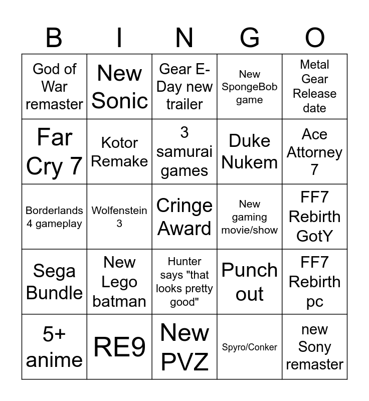 This bingo card has a free space and 24 words: New Lego batman, RE9, 3 samurai games, 5+ anime, Metal Gear Release date, God of War remaster, Far Cry 7, New Sonic, New gaming movie/show, Hunter says "that looks pretty good", Duke Nukem, Borderlands 4 gameplay, Punch out, FF7 Rebirth pc, Kotor Remake, Spyro/Conker, FF7 Rebirth GotY, Gear E-Day new trailer, Ace Attorney 7, Wolfenstein 3, new Sony remaster, Sega Bundle, New SpongeBob game and New PVZ.