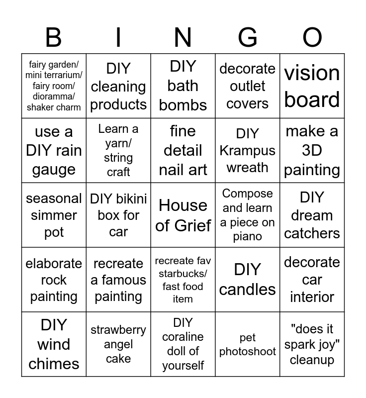 This bingo card has a free space and 24 words: DIY wind chimes, recreate a famous painting, fine detail nail art, pet photoshoot, vision board, fairy garden/ mini terrarium/ fairy room/ dioramma/ shaker charm, DIY cleaning products, DIY bath bombs, Compose and learn a piece on piano, DIY dream catchers, seasonal simmer pot, Learn a yarn/ string craft, DIY candles, decorate car interior, use a DIY rain gauge, strawberry angel cake, DIY coraline doll of yourself, decorate outlet covers, make a 3D painting, elaborate rock painting, DIY bikini box for car, recreate fav starbucks/ fast food item, DIY Krampus wreath and "does it spark joy" cleanup.