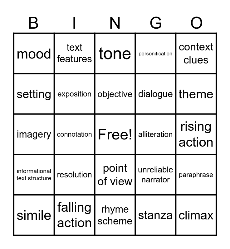 This bingo card has a free space and 29 words: simile, metaphor, connotation, denotation, mood, tone, exposition, resolution, alliteration, falling action, rising action, climax, rhyme scheme, stanza, theme, conflict, point of view, informational text structure, context clues, imagery, unreliable narrator, central / main idea, dialogue, setting, personification, text features, paraphrase, objective and claim / thesis.