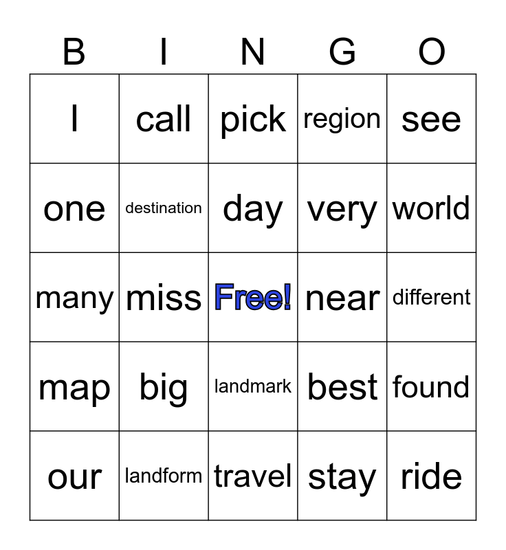 This bingo card has a free space and 24 words: big, landform, day, our, see, I, one, call, near, landmark, very, many, best, found, destination, stay, different, pick, world, miss, ride, map, region and travel.