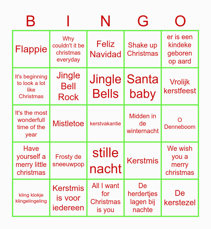This bingo card has a free space and 31 words: All I want for Christmas is you, Last Christmas, Mistletoe, Santa Claus is coming to town, Flappie, Feliz Navidad, Jingle Bell Rock, Kerstmis, Midden in de winternacht, De herdertjes lagen bij nachte, O Denneboom, De kerstezel, Let it snow, Niets is cooler dan kerstmis, Vrolijk kerstfeest, Ik ben een kerstbal, We wish you a merry christmas, Frosty de sneeuwpop, Have yourself a merry little christmas, stille nacht, er is een kindeke geboren op aard, rudolf dat is een rendier, kling klokje klingelingeling, Why couldn't it be christmas everyday, Santa baby, It's beginning to look a lot like Christmas, Shake up Christmas, It's the most wonderfull time of the year, Kerstmis is voor iedereen, Jingle Bells and Somebody that I used to know.
