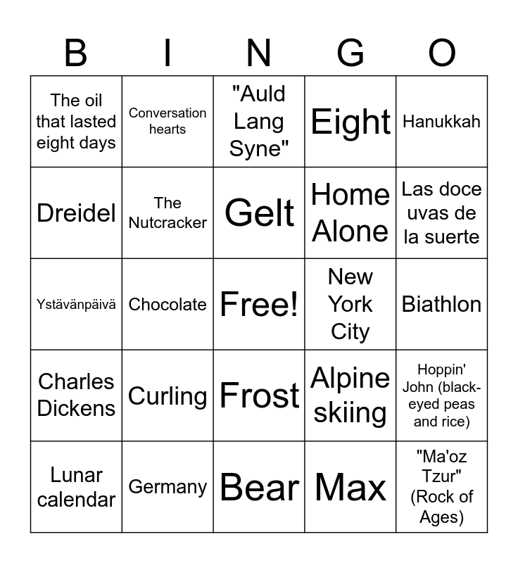 This bingo card has a free space and 60 words: Rudolph, Germany, "White Christmas" by Bing Crosby, Charles Dickens, Max, Turkey, The Nutcracker, Frosty, Home Alone, "Merry Christmas" and "Season's Greetings", Eight, Menorah, Dreidel, Hanukkah, Latkes (potato pancakes), The oil that lasted eight days, "Ma'oz Tzur" (Rock of Ages), Hanukkah, Latkes, Gelt, New York City, "Auld Lang Syne", Lunar calendar, Hoppin' John (black-eyed peas and rice), Rose Parade, Kiribati, Janus, Oshogatsu, Las doce uvas de la suerte, Sydney New Year's Eve Fireworks, Cupid, Galentine's Day, Rose, Romeo and Juliet, Conversation hearts, Valentine's Day, "All You Need Is Love", Chocolate, Twilight, Ystävänpäivä, Luge, Curling, Biathlon, Figure skating, Alpine skiing, Blizzard, Frost, Winter solstice, Sleet, Frost, Bear, Robin, Polar bear, Vole, Arctic fox, Hot chocolate, Glühwein, Gingerbread house, Latkes and S'mores.