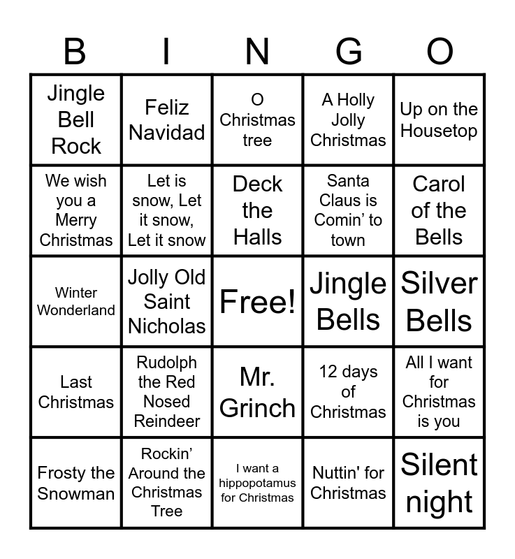 This bingo card has a free space and 24 words: Rudolph the Red Nosed Reindeer, Rockin’ Around the Christmas Tree, Deck the Halls, Frosty the Snowman, Up on the Housetop, Jingle Bell Rock, We wish you a Merry Christmas, Feliz Navidad, Jingle Bells, Mr. Grinch, Santa Claus is Comin’ to town, Winter Wonderland, 12 days of Christmas, All I want for Christmas is you, Let is snow, Let it snow, Let it snow, Nuttin' for Christmas, Silver Bells, O Christmas tree, Carol of the Bells, Jolly Old Saint Nicholas, Silent night, Last Christmas, A Holly Jolly Christmas and I want a hippopotamus for Christmas.