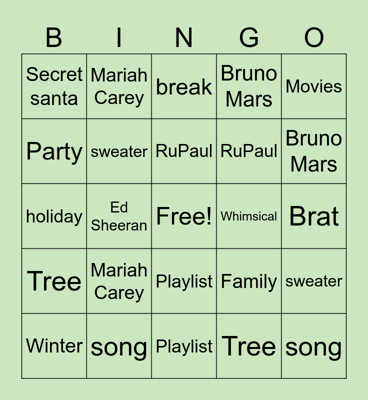 ⚠ This card has duplicate items: Secret santa (2), holiday (2), break (2), sweater (2), song (2), Playlist (2), RuPaul (2), Cookies (2), Movies (2), Tree (2), Ed Sheeran (2), Bruno Mars (2), Brat (2), Whimsical (2), Mariah Carey (2), Winter (2)
