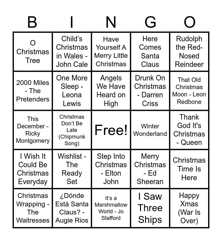 This bingo card has a free space and 97 words: Christmas Without You - Ava Max, Away In a Manger, Feliz Navidad - José Feliciano, Christmas Don’t Be Late (Chipmunk Song), Cozy Little Christmas - Katy Perry, Fairytale of New York - The Pogues, What Christmas Means to Me, Do You Hear What I Hear? - Whitney Houstin, Hark! The Angels Sing, I’m Gettin Nuttin for Christmas, Driving Home For Christmas - Chris Rea, Blue Christmas - Elvis Presley, Santa Claus Is Comin' to Town, I Wish It Could Be Christmas Everyday, O Holy Night - Céline Dion, O Christmas Tree, Rudolph the Red-Nosed Reindeer, Grown-Up Christmas List - Amy Grant, Good King Wenceslas - Jennifer Jones, Please Come Home for Christmas - Eagles, Jingle Bell Rock, Jingle Bells, Let It Snow! Let It Snow! Let It Snow!, Silver Bells, I Saw Mommy Kissing Santa Claus, Angels We Have Heard on High, Christmas Wrapping - The Waitresses, Christmas Time Is Here, It’s Beginning to Look a Lot Like Christmas, Merry Christmas Happy Holidays - *NSYNC, One More Sleep - Leona Lewis, Here Comes Santa Claus, 8 Days of Christmas - Destiny’s Child, Christmas Lights - Coldplay, It’s a Marshmallow World - Jo Stafford, Step Into Christmas - Elton John, Christmas Tree Farm - Taylor Swift, Oh It’s Christmas! - Jordan Sparks, ELF - Main theme, This December - Ricky Montgomery, The Holly and the Ivy, Thank God It's Christmas - Queen, Little Saint Nick - The Beach Boys, I Saw Three Ships, Wishlist - The Ready Set, God Rest Ye Merry Gentlemen, It Came Upon A Midnight Clear, You Make It Feel Like Christmas - Gwen Stefani, Joy to the World, Last Christmas, Santa Baby, Carol of the Bells, Christmas in Hollis - Run D.M.C., We Three Kings - Dolly Parton, The Nutcracker Suite, All I Want for Christmas Is You, Mistletoe - Justin Bieber, Child’s Christmas in Wales - John Cale, Sleigh Ride, Frosty the Snowman - Billy Idol, Six Cups of Eggnog - Larry Costa, Santa Tell Me - Ariana Grande, It’s the Most Wonderful Time of the Year, A Nonsense Christmas - Sabrina Carpenter, Silent Night, My Only Wish (This Year) - Britney Spears, White Christmas - Bing Crosby, Holly Jolly Christmas, Welcome Christmas (Dahoo Dores), ¿Dónde Está Santa Claus? - Augie Rios, Drunk On Christmas - Darren Criss, Hallelujah - Leonard Cohen, Ode to Joy - Beethoven, Little Drummer Boy, Happy Holidays, The Christmas Song (Merry Christmas to You), We Are The World - U.S.A. For Africa, Wonderful Christmastime, Winter Wonderland, Underneath the Tree - Kelly Clarkson, Run Rudolph Run, That Old Christmas Moon - Leon Redbone, Christmas Rappin’ - Kurtis Blow, DJ Play A Christmas Song, My Favourite Time of Year - Pete Masitti, Holiday Road - Kesha, Happy Xmas (War Is Over), O Come All Ye Faithful - Pentatonix, Domnick the Donkey - Lou Monte, I’ll Be Home - Meghan Trainor, Have Yourself A Merry Little Christmas, Rockin' Around The Christmas Tree, Christmas (Baby Please Come Home) - Darlene Love, Merry Christmas - Ed Sheeran, 2000 Miles - The Pretenders, Snowman - Sia and Joyful Joyful We Adore Thee.