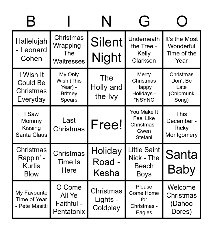 This bingo card has a free space and 97 words: Good King Wenceslas - Jennifer Jones, Fairytale of New York - The Pogues, Angels We Have Heard on High, Last Christmas, Santa Claus Is Comin' to Town, Step Into Christmas - Elton John, Wonderful Christmastime, Six Cups of Eggnog - Larry Costa, Happy Xmas (War Is Over), Joyful Joyful We Adore Thee, We Three Kings - Dolly Parton, Have Yourself A Merry Little Christmas, Christmas (Baby Please Come Home) - Darlene Love, Christmas Rappin’ - Kurtis Blow, It Came Upon A Midnight Clear, Hallelujah - Leonard Cohen, It’s the Most Wonderful Time of the Year, Christmas Tree Farm - Taylor Swift, All I Want for Christmas Is You, ELF - Main theme, That Old Christmas Moon - Leon Redbone, Child’s Christmas in Wales - John Cale, ¿Dónde Está Santa Claus? - Augie Rios, Blue Christmas - Elvis Presley, It’s a Marshmallow World - Jo Stafford, The Holly and the Ivy, My Favourite Time of Year - Pete Masitti, Santa Baby, Winter Wonderland, Rockin' Around The Christmas Tree, My Only Wish (This Year) - Britney Spears, Underneath the Tree - Kelly Clarkson, Happy Holidays, O Holy Night - Céline Dion, Christmas Lights - Coldplay, Holiday Road - Kesha, Wishlist - The Ready Set, The Nutcracker Suite, I Saw Three Ships, I Saw Mommy Kissing Santa Claus, Thank God It's Christmas - Queen, This December - Ricky Montgomery, Drunk On Christmas - Darren Criss, Please Come Home for Christmas - Eagles, Christmas Time Is Here, I’m Gettin Nuttin for Christmas, Holly Jolly Christmas, O Christmas Tree, Christmas in Hollis - Run D.M.C., Here Comes Santa Claus, Hark! The Angels Sing, Jingle Bell Rock, Run Rudolph Run, Let It Snow! Let It Snow! Let It Snow!, Feliz Navidad - José Feliciano, Mistletoe - Justin Bieber, DJ Play A Christmas Song, Christmas Wrapping - The Waitresses, God Rest Ye Merry Gentlemen, Driving Home For Christmas - Chris Rea, Carol of the Bells, Merry Christmas - Ed Sheeran, Ode to Joy - Beethoven, 8 Days of Christmas - Destiny’s Child, Snowman - Sia, White Christmas - Bing Crosby, Jingle Bells, It’s Beginning to Look a Lot Like Christmas, What Christmas Means to Me, O Come All Ye Faithful - Pentatonix, Merry Christmas Happy Holidays - *NSYNC, Domnick the Donkey - Lou Monte, Frosty the Snowman - Billy Idol, I’ll Be Home - Meghan Trainor, One More Sleep - Leona Lewis, Oh It’s Christmas! - Jordan Sparks, Cozy Little Christmas - Katy Perry, We Are The World - U.S.A. For Africa, You Make It Feel Like Christmas - Gwen Stefani, Little Drummer Boy, The Christmas Song (Merry Christmas to You), Christmas Don’t Be Late (Chipmunk Song), Joy to the World, Silver Bells, Do You Hear What I Hear? - Whitney Houstin, Santa Tell Me - Ariana Grande, Welcome Christmas (Dahoo Dores), Christmas Without You - Ava Max, Sleigh Ride, Rudolph the Red-Nosed Reindeer, Silent Night, Grown-Up Christmas List - Amy Grant, 2000 Miles - The Pretenders, Little Saint Nick - The Beach Boys, I Wish It Could Be Christmas Everyday, A Nonsense Christmas - Sabrina Carpenter and Away In a Manger.