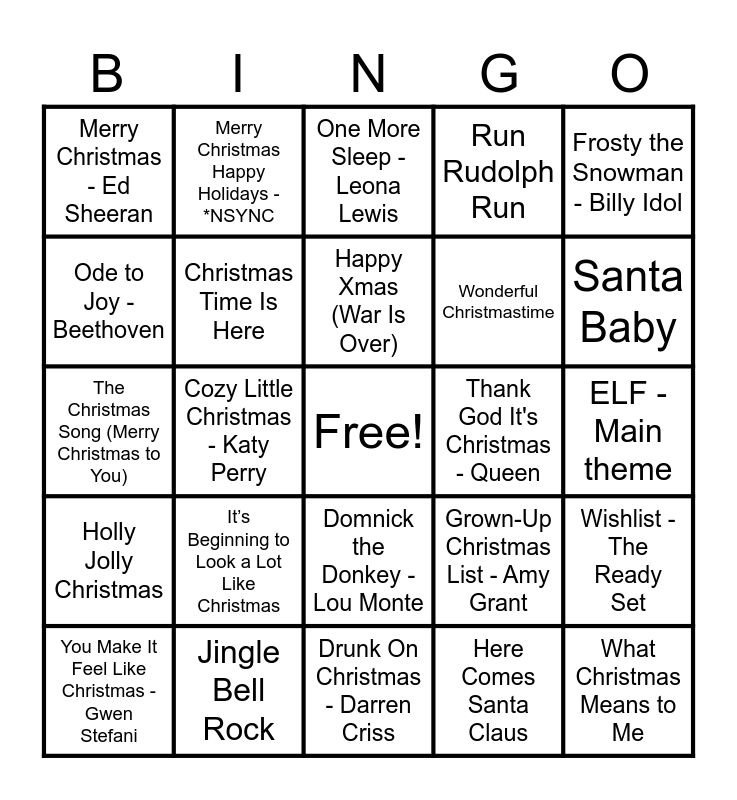 This bingo card has a free space and 97 words: Do You Hear What I Hear? - Whitney Houstin, Driving Home For Christmas - Chris Rea, 2000 Miles - The Pretenders, Cozy Little Christmas - Katy Perry, Carol of the Bells, I’ll Be Home - Meghan Trainor, Last Christmas, Let It Snow! Let It Snow! Let It Snow!, ¿Dónde Está Santa Claus? - Augie Rios, 8 Days of Christmas - Destiny’s Child, Joy to the World, It’s the Most Wonderful Time of the Year, Christmas in Hollis - Run D.M.C., Holly Jolly Christmas, Happy Holidays, Merry Christmas - Ed Sheeran, Frosty the Snowman - Billy Idol, This December - Ricky Montgomery, Rockin' Around The Christmas Tree, Santa Claus Is Comin' to Town, Sleigh Ride, White Christmas - Bing Crosby, It Came Upon A Midnight Clear, Child’s Christmas in Wales - John Cale, Christmas Wrapping - The Waitresses, Happy Xmas (War Is Over), You Make It Feel Like Christmas - Gwen Stefani, Wishlist - The Ready Set, Please Come Home for Christmas - Eagles, Angels We Have Heard on High, Christmas Time Is Here, Run Rudolph Run, Christmas Lights - Coldplay, O Holy Night - Céline Dion, Drunk On Christmas - Darren Criss, Domnick the Donkey - Lou Monte, Christmas Don’t Be Late (Chipmunk Song), We Are The World - U.S.A. For Africa, Silver Bells, The Christmas Song (Merry Christmas to You), Christmas Rappin’ - Kurtis Blow, ELF - Main theme, The Nutcracker Suite, Here Comes Santa Claus, It’s Beginning to Look a Lot Like Christmas, Little Saint Nick - The Beach Boys, Little Drummer Boy, Have Yourself A Merry Little Christmas, Step Into Christmas - Elton John, O Come All Ye Faithful - Pentatonix, Away In a Manger, O Christmas Tree, Mistletoe - Justin Bieber, Jingle Bells, We Three Kings - Dolly Parton, Welcome Christmas (Dahoo Dores), Oh It’s Christmas! - Jordan Sparks, Merry Christmas Happy Holidays - *NSYNC, Winter Wonderland, Fairytale of New York - The Pogues, Rudolph the Red-Nosed Reindeer, Underneath the Tree - Kelly Clarkson, That Old Christmas Moon - Leon Redbone, Christmas Without You - Ava Max, My Only Wish (This Year) - Britney Spears, I’m Gettin Nuttin for Christmas, Joyful Joyful We Adore Thee, It’s a Marshmallow World - Jo Stafford, Santa Tell Me - Ariana Grande, Jingle Bell Rock, Wonderful Christmastime, God Rest Ye Merry Gentlemen, Silent Night, Feliz Navidad - José Feliciano, A Nonsense Christmas - Sabrina Carpenter, Six Cups of Eggnog - Larry Costa, Christmas Tree Farm - Taylor Swift, Snowman - Sia, Thank God It's Christmas - Queen, Blue Christmas - Elvis Presley, Hark! The Angels Sing, Santa Baby, Good King Wenceslas - Jennifer Jones, Hallelujah - Leonard Cohen, The Holly and the Ivy, My Favourite Time of Year - Pete Masitti, What Christmas Means to Me, All I Want for Christmas Is You, I Saw Mommy Kissing Santa Claus, Holiday Road - Kesha, One More Sleep - Leona Lewis, I Saw Three Ships, I Wish It Could Be Christmas Everyday, Grown-Up Christmas List - Amy Grant, Ode to Joy - Beethoven, DJ Play A Christmas Song and Christmas (Baby Please Come Home) - Darlene Love.