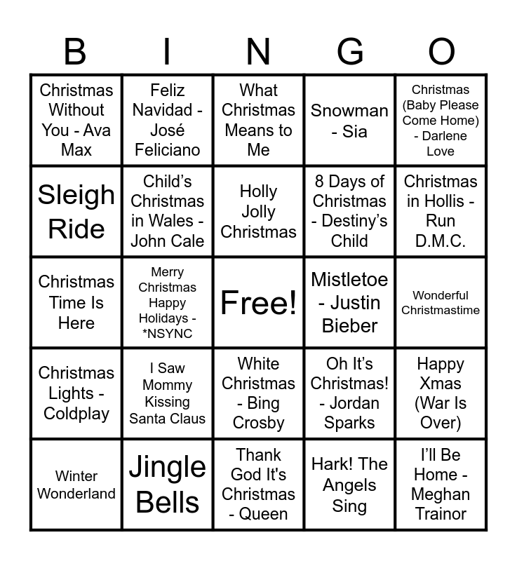 This bingo card has a free space and 97 words: I Saw Three Ships, That Old Christmas Moon - Leon Redbone, I’m Gettin Nuttin for Christmas, Merry Christmas Happy Holidays - *NSYNC, My Only Wish (This Year) - Britney Spears, Joy to the World, The Nutcracker Suite, Santa Baby, Do You Hear What I Hear? - Whitney Houstin, The Holly and the Ivy, A Nonsense Christmas - Sabrina Carpenter, The Christmas Song (Merry Christmas to You), Run Rudolph Run, Christmas Lights - Coldplay, Wishlist - The Ready Set, Christmas Without You - Ava Max, Christmas (Baby Please Come Home) - Darlene Love, It Came Upon A Midnight Clear, All I Want for Christmas Is You, Good King Wenceslas - Jennifer Jones, Frosty the Snowman - Billy Idol, We Are The World - U.S.A. For Africa, Fairytale of New York - The Pogues, O Christmas Tree, O Holy Night - Céline Dion, Holly Jolly Christmas, Winter Wonderland, Happy Xmas (War Is Over), Please Come Home for Christmas - Eagles, Away In a Manger, Child’s Christmas in Wales - John Cale, Snowman - Sia, DJ Play A Christmas Song, You Make It Feel Like Christmas - Gwen Stefani, Thank God It's Christmas - Queen, White Christmas - Bing Crosby, Christmas Tree Farm - Taylor Swift, ELF - Main theme, Have Yourself A Merry Little Christmas, Christmas Time Is Here, My Favourite Time of Year - Pete Masitti, Wonderful Christmastime, It’s the Most Wonderful Time of the Year, Hark! The Angels Sing, I Saw Mommy Kissing Santa Claus, We Three Kings - Dolly Parton, Blue Christmas - Elvis Presley, Silver Bells, Drunk On Christmas - Darren Criss, Cozy Little Christmas - Katy Perry, 2000 Miles - The Pretenders, Grown-Up Christmas List - Amy Grant, Merry Christmas - Ed Sheeran, It’s a Marshmallow World - Jo Stafford, Rockin' Around The Christmas Tree, Little Saint Nick - The Beach Boys, Santa Claus Is Comin' to Town, Feliz Navidad - José Feliciano, Driving Home For Christmas - Chris Rea, Jingle Bell Rock, This December - Ricky Montgomery, Rudolph the Red-Nosed Reindeer, Christmas Rappin’ - Kurtis Blow, Six Cups of Eggnog - Larry Costa, Silent Night, Happy Holidays, I Wish It Could Be Christmas Everyday, Joyful Joyful We Adore Thee, Christmas Wrapping - The Waitresses, Jingle Bells, 8 Days of Christmas - Destiny’s Child, One More Sleep - Leona Lewis, God Rest Ye Merry Gentlemen, Ode to Joy - Beethoven, Angels We Have Heard on High, Christmas Don’t Be Late (Chipmunk Song), Domnick the Donkey - Lou Monte, Let It Snow! Let It Snow! Let It Snow!, Mistletoe - Justin Bieber, O Come All Ye Faithful - Pentatonix, Carol of the Bells, Christmas in Hollis - Run D.M.C., Underneath the Tree - Kelly Clarkson, Here Comes Santa Claus, Holiday Road - Kesha, Step Into Christmas - Elton John, I’ll Be Home - Meghan Trainor, Last Christmas, Welcome Christmas (Dahoo Dores), ¿Dónde Está Santa Claus? - Augie Rios, What Christmas Means to Me, Little Drummer Boy, Santa Tell Me - Ariana Grande, Oh It’s Christmas! - Jordan Sparks, Sleigh Ride, It’s Beginning to Look a Lot Like Christmas and Hallelujah - Leonard Cohen.